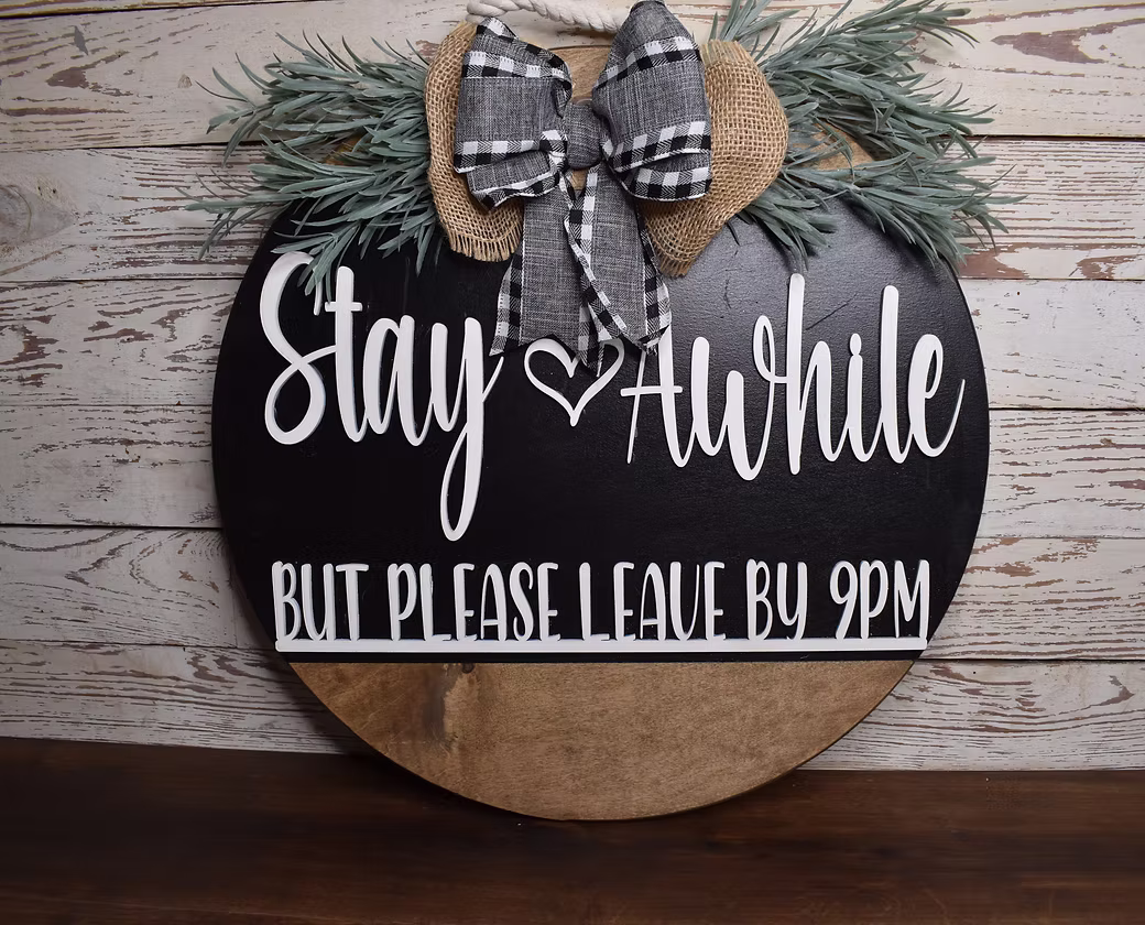 Make your guests feel at home with our Stay Awhile door hanger. Measuring 18 inches in length, this charming piece is the perfect addition to any front door. Crafted with a 1/2 inch round design and 1/8 inch cut out words, it adds a touch of elegance to your home décor. Made with excellent quality materials to last for years to come.